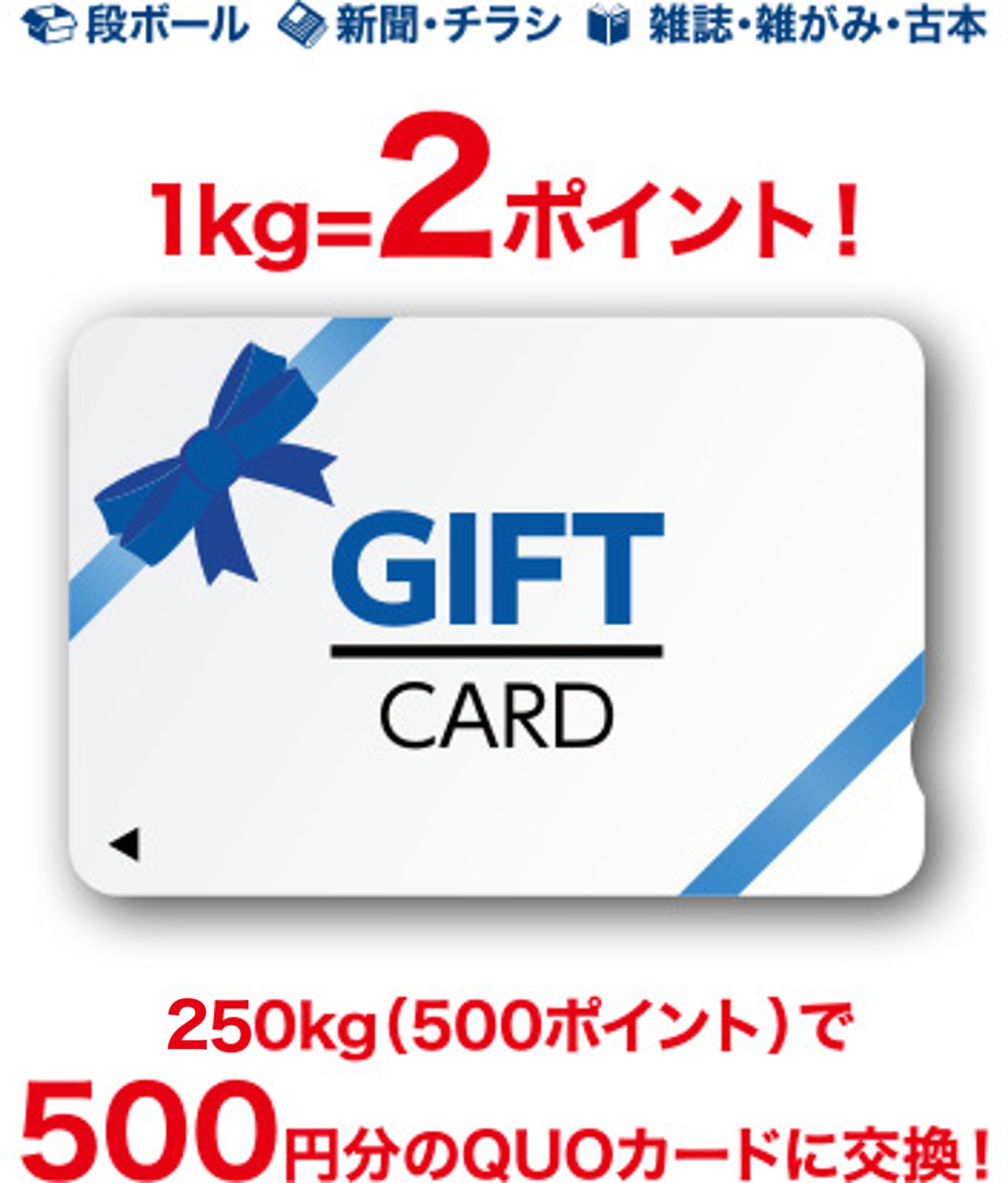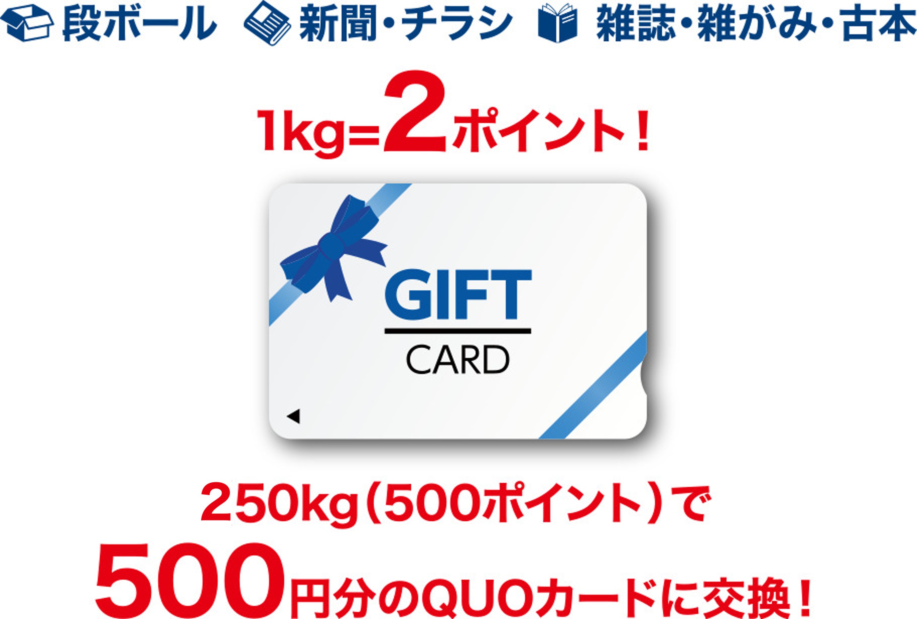 ・ポイントが500ポイント貯まりますと、QUOカードと交換いたします。・ポイントはお持ち頂いた古紙1kgあたり2ポイントを付与します。・ポイント倍率は設置場所により異なる場合や市場価格により変動する場合がございます。 ・ポイントの付け方・ポイント倍率は各設置場所でご確認ください。・個人が特定できる書類などは持ち込まないようにご協力をお願い致します。 画像はイメージです。